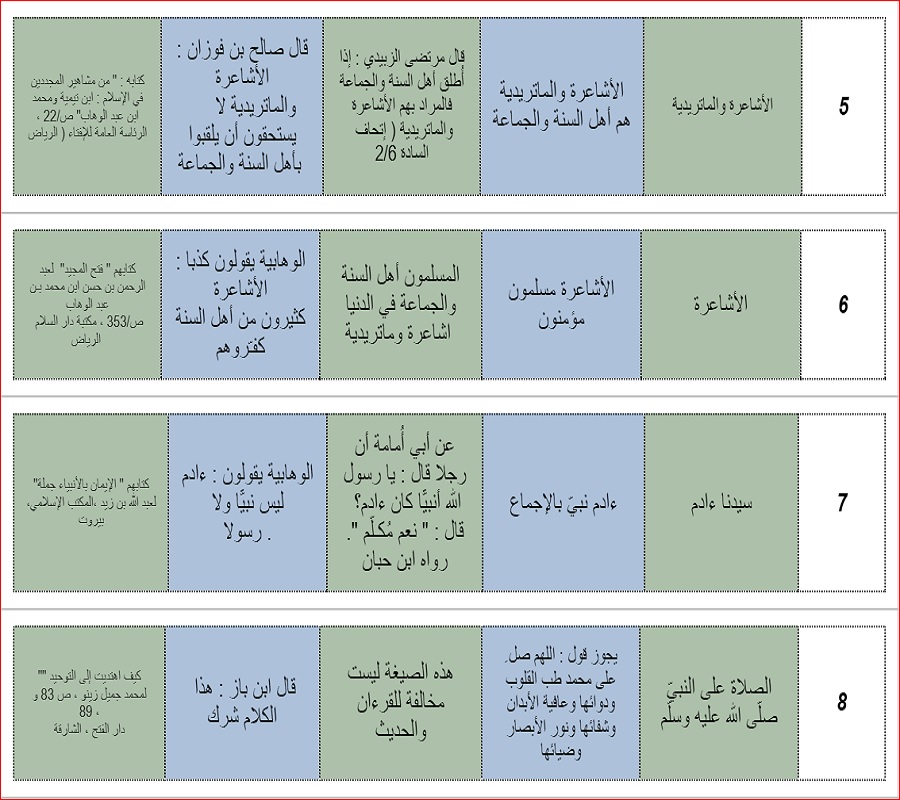ومن خلال هذه اللائحة سيتضح للقارئ انحراف اقوال علماء الوهابية و فتاواهم عما عليه سائر العلماء قديما و حديثا ، فتراهم يشبهون الله بالبشر و البهائم و الجالس على كرسيه و كونه فوق العرش بذاته ، و نفي بعض علمائهم كون الاشاعرة و الماتريدية من اهل السنة و هذا ما يثبت انهم يعتبرون انفسهم المسلمين دون غيرهم ، فاليك هذه القائمة مع ذكر المصادر التي تدل على اقوالهم و فتاواهم ……