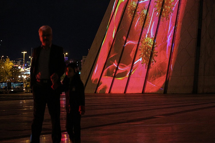 وتضمنت الاضاءة ثلاثية الأبعاد، رسائل مختلفة للمواطنين وللشعوب حول العالم بشان كورونا.