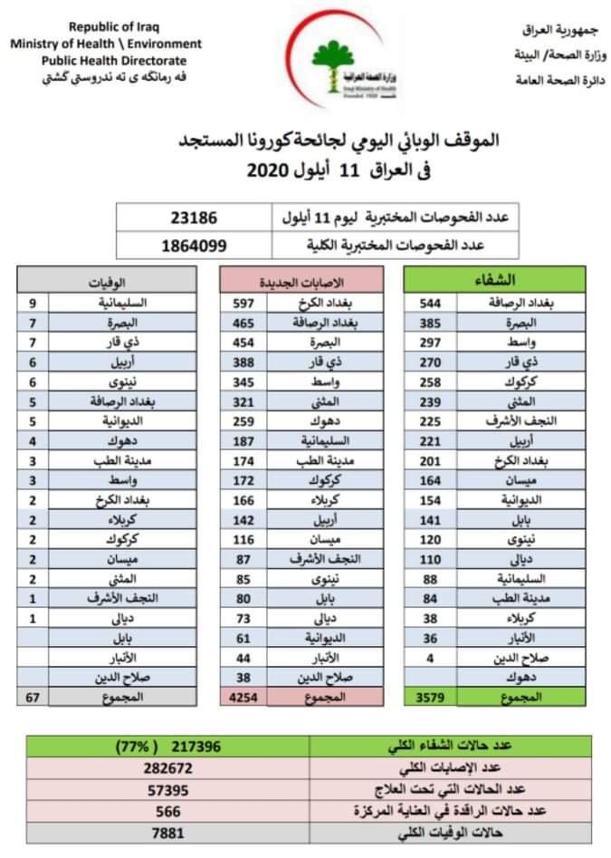 العراق_الكوثر: اعلنت وزارة الصحة العراقية، اليوم الجمعة، عن تسجيل 4254 إصابة جديدة بفيروس كورونا، ووفاة 67 حالة، فيما اشارت الى تماثل 3579 حالة جديدة للشفاء من الفيروس.