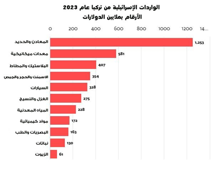يعتقد الخبراء أن جزءًا كبيرًا من الفولاذ المستخدم في الصناعات العسكرية الإسرائيلية، التي تزود الأسلحة لقتل الشعب الفلسطيني، يتم توفيره عبر تركيا. بالإضافة إلى ذلك، يتم توفير حوالي نصف النفط الذي تحتاجه إسرائيل أيضًا عبر خط أنابيب يمر عبر تركيا.